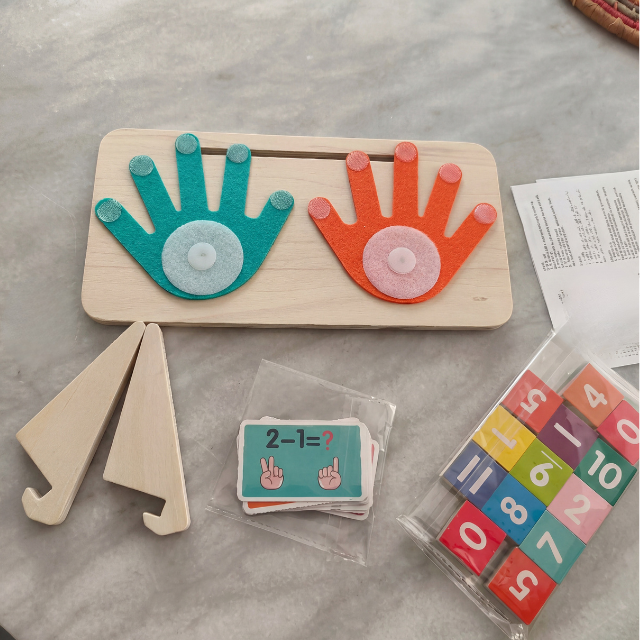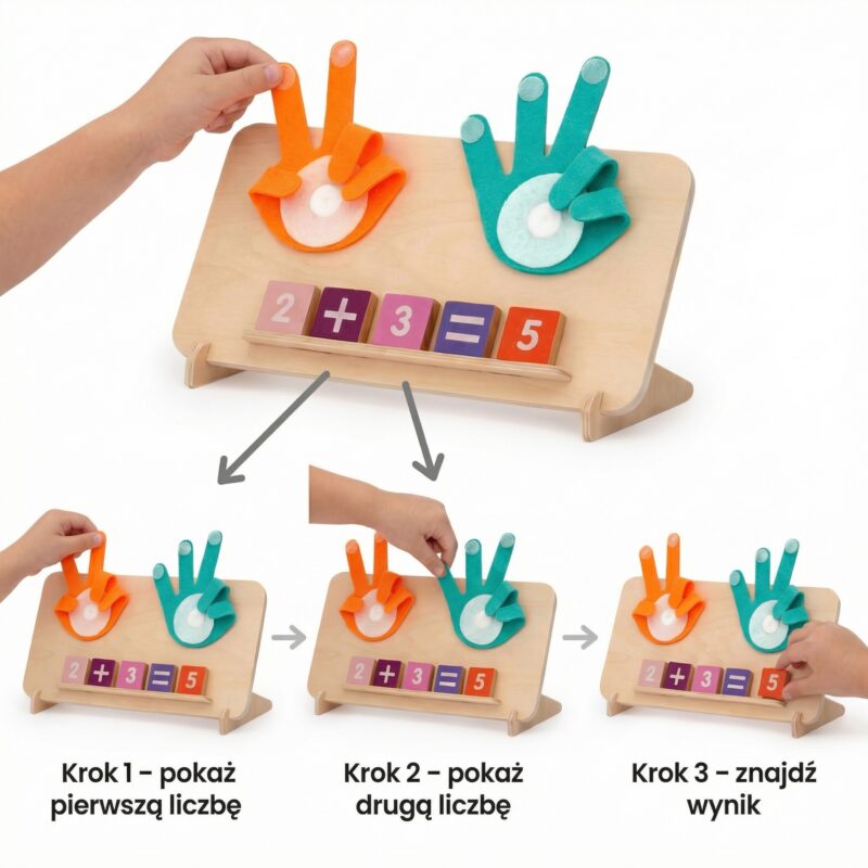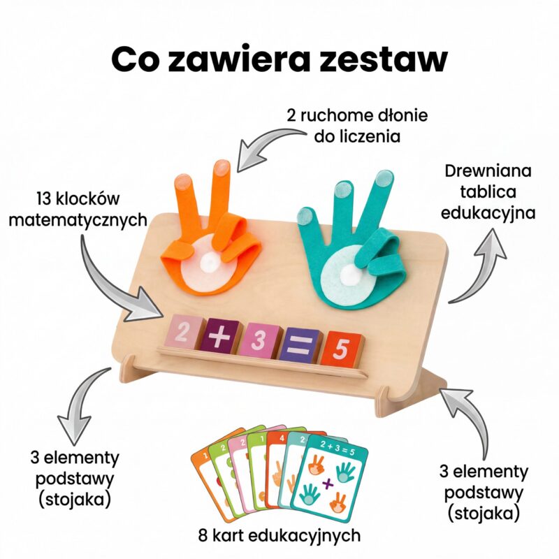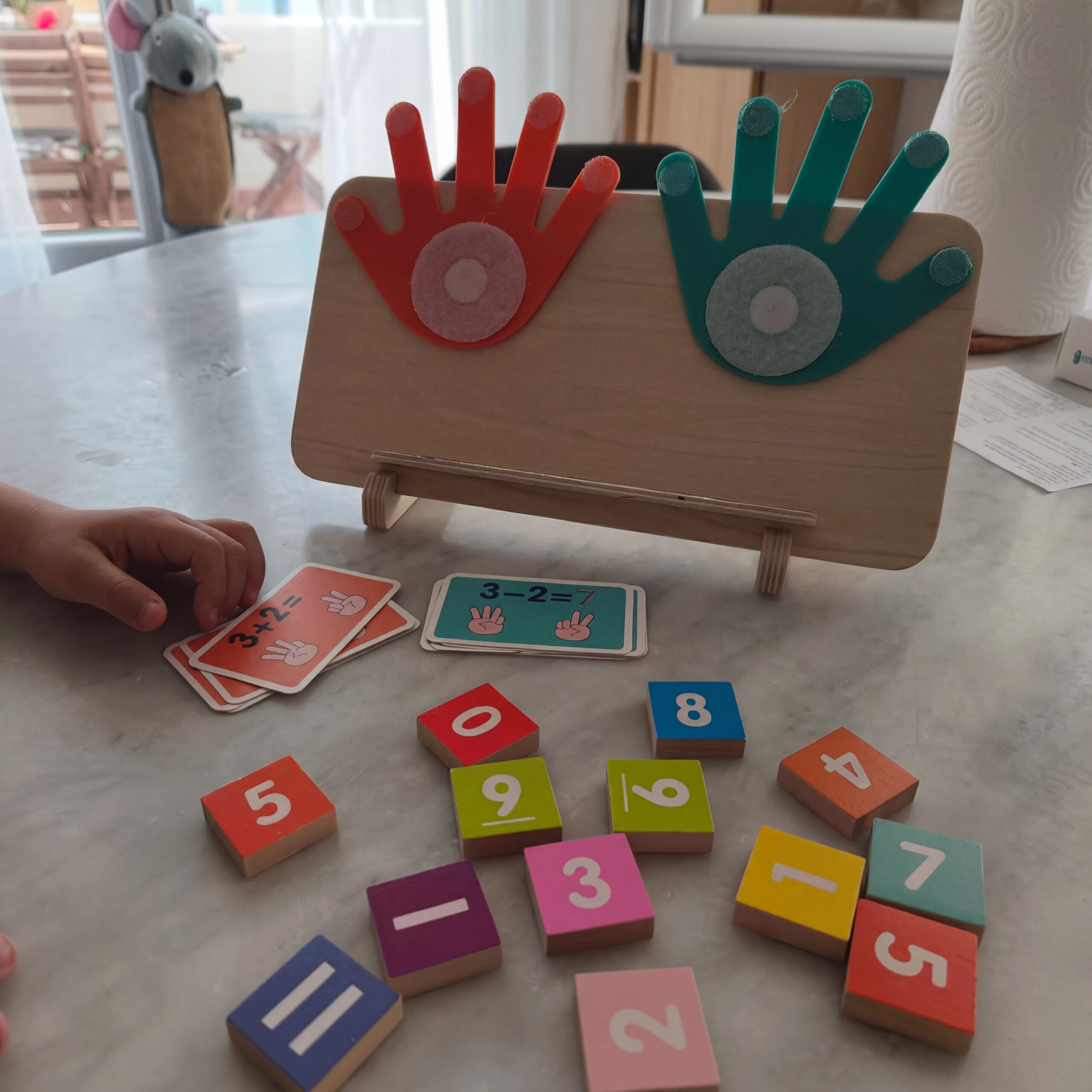 Dzięki kolorowym dłoniom i klockom z działaniami matematycznymi maluch sam odkrywa, jak działają liczby i proste działania.🔢